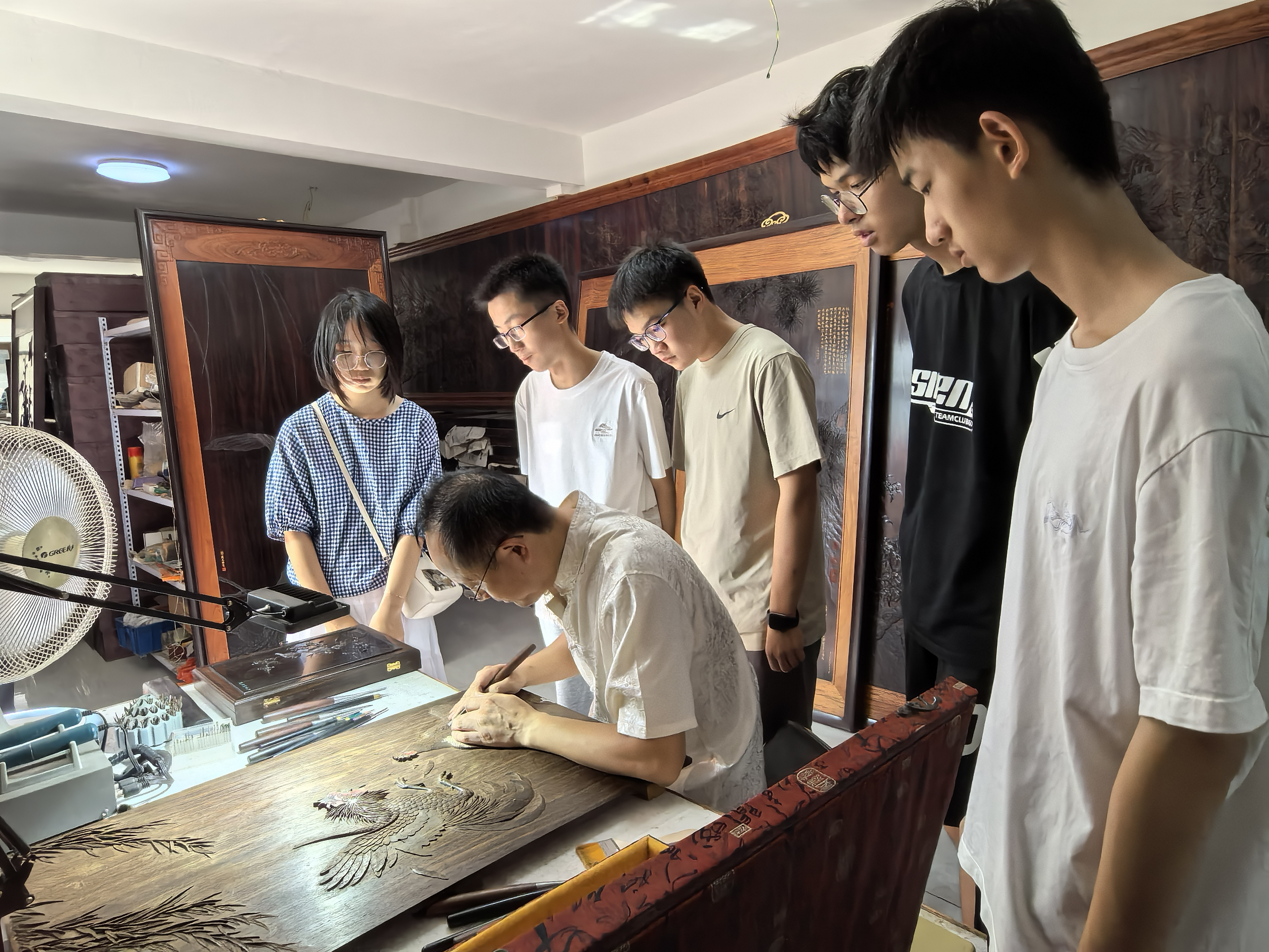 近日,来自如皋白蒲高级中学高一新生代表走进长江镇田桥社区,寻访工笔精雕大师薛爱民,见证刻刀如何赋予木头沉默的生命。