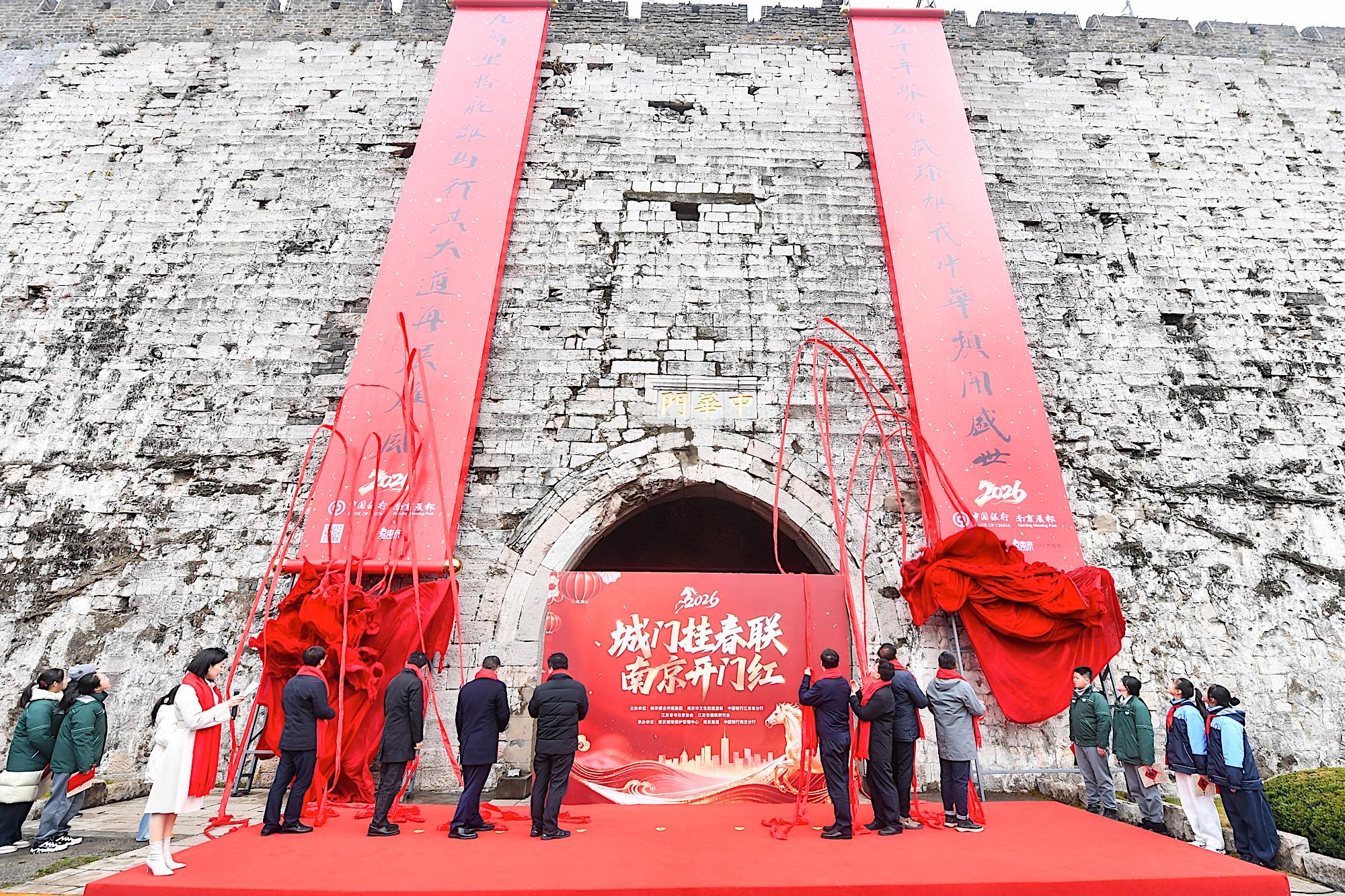 “五千年聚宝藏珍,耀我中华,频开盛世;九万里腾龙跃马,行其大道,再展雄风。”一副长十五米、宽两米的巨幅大红春联,于1月31日上午在南京中华门瓮城震撼亮相,正式拉开丙午马年新春序幕。由新华报业传媒集团、南京市文化和旅游局、中国银行江苏省分行、江苏省书法家协会、江苏省楹联研究会联合主办,南京城墙保护管理中心、南京晨报、中国银行南京分行共同承办的2026年第十一季“城门挂春联 南京开门红”揭联仪式,在中华门隆重举行。南京市领导及各单位相关负责人出席。中国银行江苏省分行副行长兼南京分行行长陈新宏出席揭联仪式并致辞。