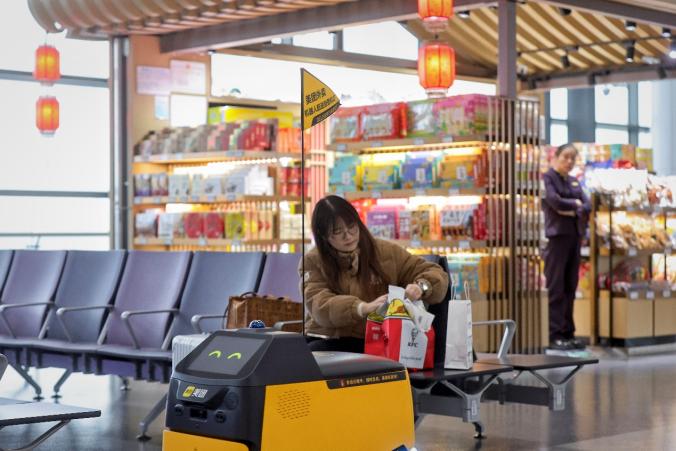 春运期间,机场客流量激增,旅客在候机时面临“不敢走远买吃的”或“买完还要拎着大包小包赶路”的窘境。“以前赶航班或者饭点候机,想喝杯咖啡都得跑好远,现在方便多了。”在机场候机的旅客王女士体验了一把“小黄蜂”专送服务——美团App下单,不到10分钟,机器人就到了,王女士输入取餐码,舱门自动弹开,咖啡依然温热。