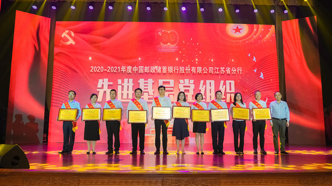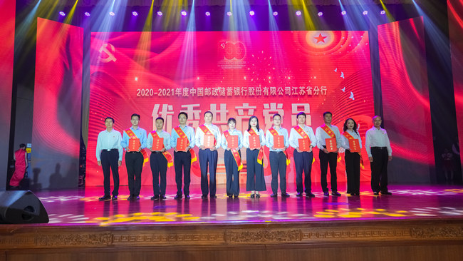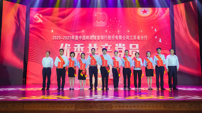 表彰大会上,中共江苏省委省级机关工委副书记李恩和以及邮储银行江苏省分行党委成员为获奖代表颁奖,授予冯遵典等70名同志为“优秀共产党员”、徐清琰等10名同志为“优秀党务工作者”,南京市分行江宁区支行党支部等20个党组织为“先进基层党组织”称号。