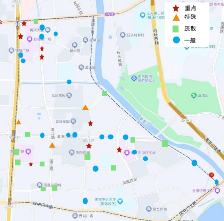 街道与运营公司将凤凰西街、清凉门大街等单车聚集数量达到30辆以上路段、龙江地铁口以及环宇城、新城市广场、清江苏宁广场三个大型商业综合体周边等车辆需求大区域划为重点点位;将南京审计大学、商业学校、二十九中等潮汐量大,需及时调运的区域划设为特殊点位;将适合设置临时调运点、方便调运周边积压车辆、可以暂时存放的区域划设为一般点位;将老旧小区周边、占道经营突出街区、口袋公园内部等难以划设共享单车停放区域的,不具备调运条件的路段一律划定为疏散点位。