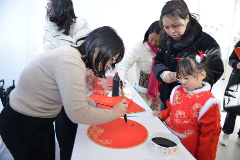 活动现场热闹非凡,长桌一字排开,宣纸铺展、墨香弥漫,书法协会的老师们挥毫泼墨,为大家写春联、送福字。
