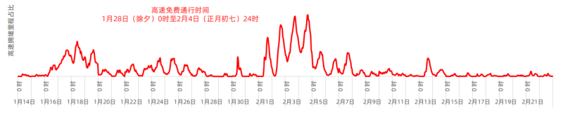 此外,根据交通大数据预测,春运期间,受传统走亲访友的影响,1月30日(正月初二)早晨10时-12时高速会有短时拥堵,2月3日(正月初六)、2月4日(正月初七)下午为高速返程拥堵高峰时段,尤其是2月4日(正月初七)14时-19时。