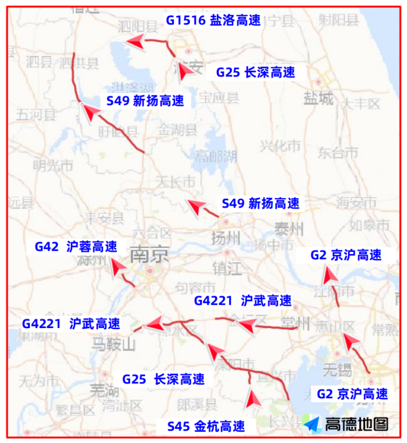 根据高德地图交通大数据预测,受春节假期提前出行影响,预计明日(1月18日,腊月十九)江苏省高速将迎来出程拥堵高峰,易拥堵缓行的高速主要是G25长深高速、S45金杭高速、G2京沪高速、S49新扬高速等高速的部分路段;建议行驶到以下路段的车主时刻注意路况,及时躲避拥堵。