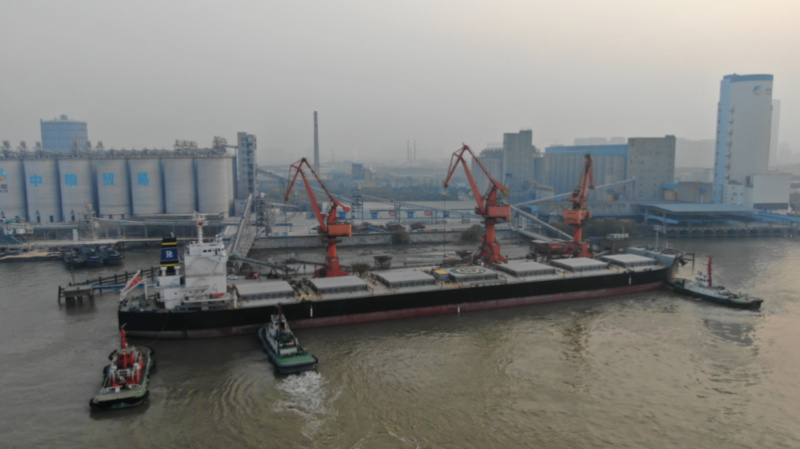 9月14日,“泛洋江津”轮在江阴中粮码头完成装卸作业,载运5400吨夏粮,缓缓离泊,驶往下一港。