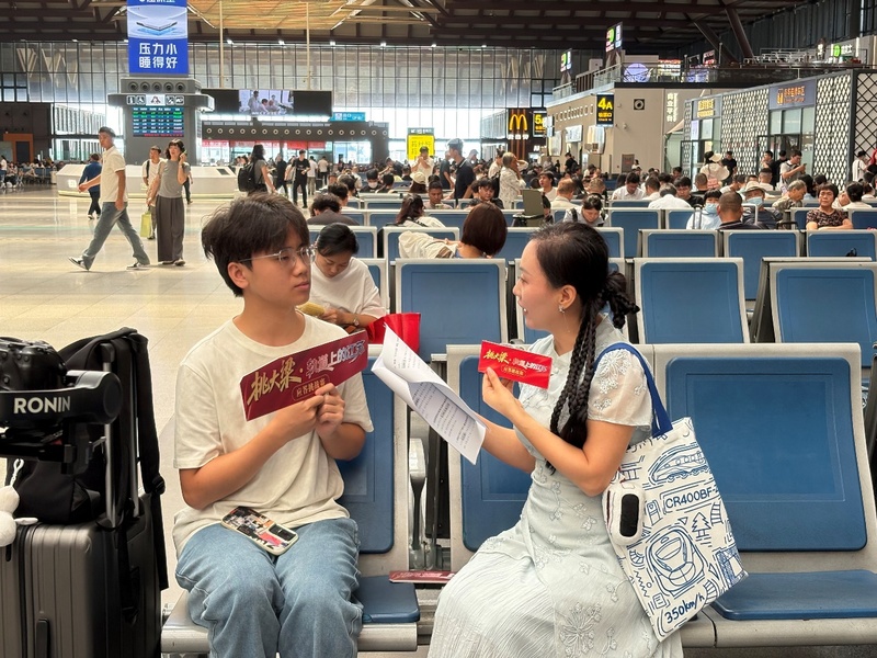 活动现场,新华日报・交汇点记者、全网百万粉丝博主及铁路一线青年代表组成“应答小队”,在车站内寻找“高铁达人”,以行进式答题挑战的方式与旅客开展了一场别开生面的进阶式挑战赛。