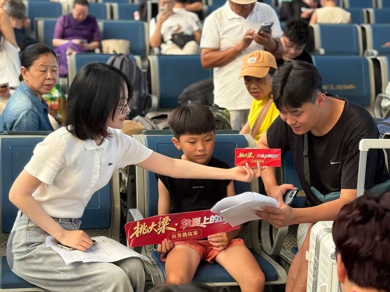 “目前我国高铁最高运行时速达多少?”“乘坐高铁静音车厢时需注意什么?”“长三角首趟‘苏超’球迷高铁专列在哪个火车站开行?”……当“应答小队”抛出一个个生动有趣的问题,瞬间吸引了不少候车旅客前来挑战。