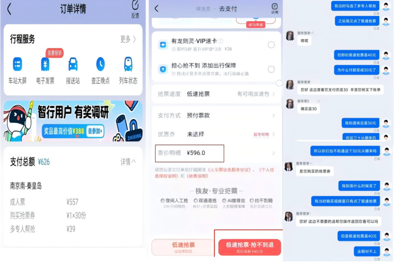 在一次实测中,体验员在铁友平台购买南京南-秦皇岛G1236车次,原本只勾选39元“多专人帮抢”,预期应支付596元(票价557元+服务39元),但到支付环节总价却变为626元,多出30元;经查为订单被额外添加“购买抢票券”。更不合理的是,界面按钮标注“需额外付40元加速包”,与实际扣费30元不一致,而客服亦无法解释差异,反映出界面诱导与价格标注不一致的隐性消费问题。