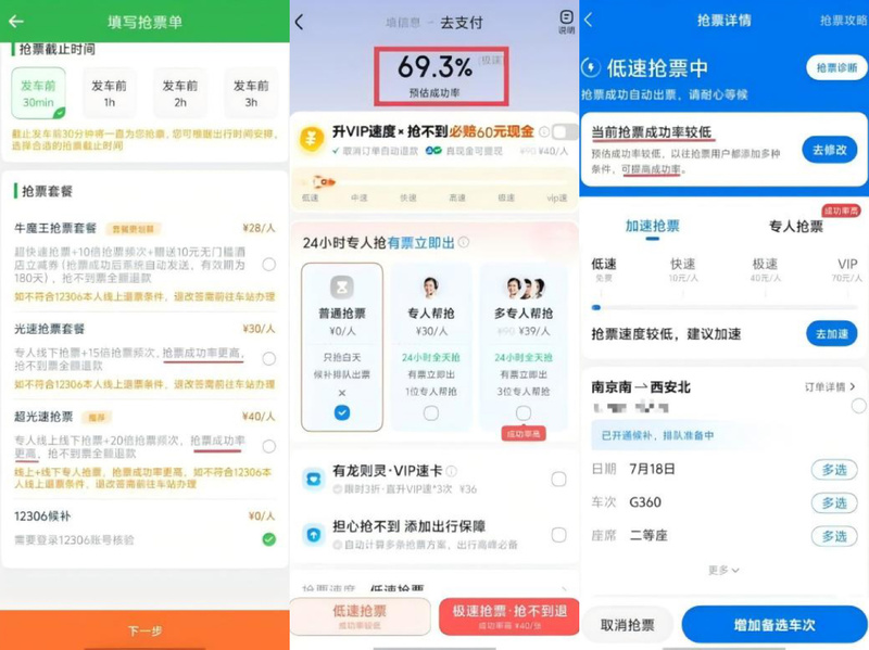 在相同车次、相同时间提交的订单中,加速包的抢票成功率并不明显高于普通候补,部分平台的“加速包”甚至连续多次未能成功出票。所谓“加速”更多停留在营销层面,实际作用有限。