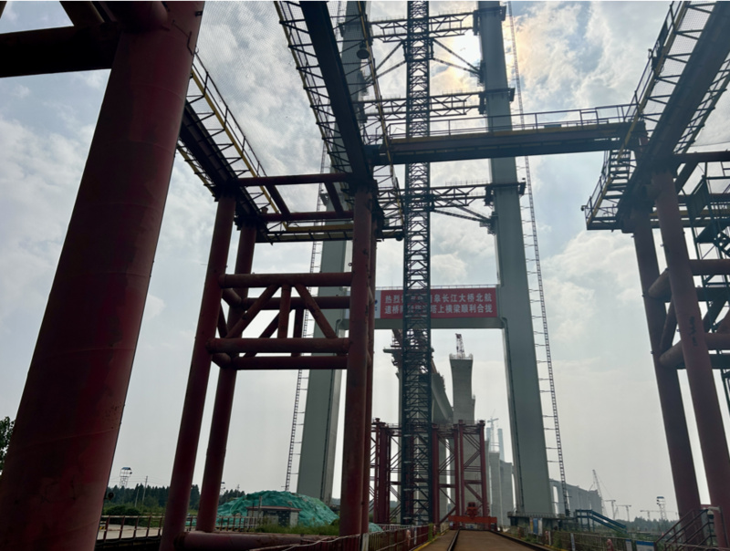 站在如皋华泰码头远眺,大桥北航道桥南、北两座主塔如百层高楼般屹立江面、遥遥相望。江风穿过钢结构的空隙,带着湿润的水汽,让钢材的本色变得愈发清晰。“南、北主塔均创新采用门式钢箱架构造,主体高达208米,设置上、下两道横梁。”江苏省交通工程建设局张靖皋长江大桥建设指挥部现场副指挥长赵峰介绍,上横梁作为关键部位,由5个精密节段构成,总重约657吨,外壁板与加劲构件均采用高精焊接技术,对接缝隙严控在10毫米以内。