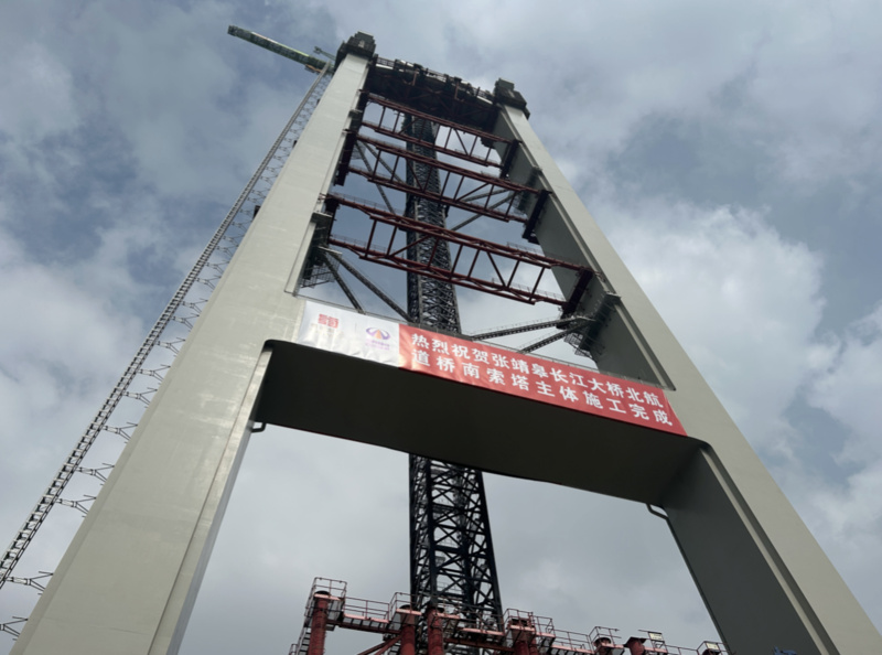 交汇点讯 9月28日,目前在建的世界最大跨径悬索桥——张靖皋长江大桥建设再迎重要节点。在超大型塔吊的精准操控下,大桥北航道桥南主塔上横梁合龙段平稳升至百米高空,实现毫米级嵌入。至此,北航道桥南北两座主塔主体施工全部完成。