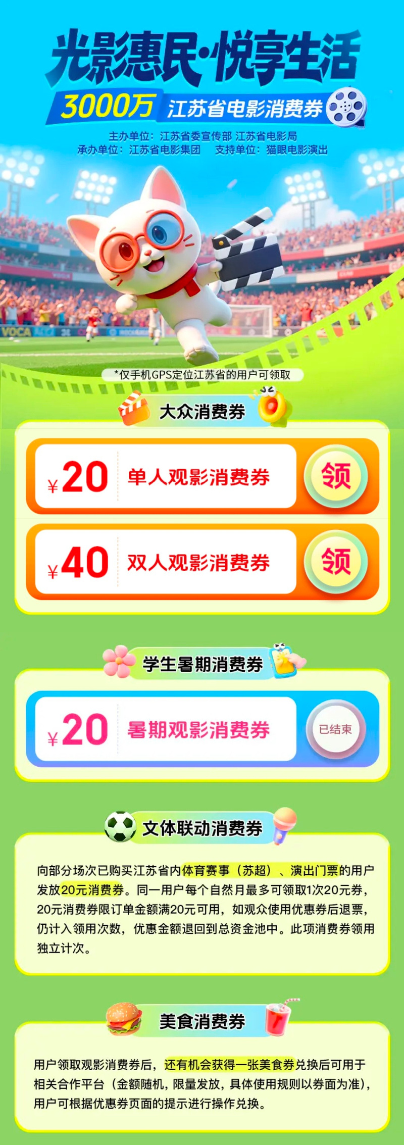 双节期间,江苏继续开展惠民观影活动,全省通过猫眼平台发放300万元电影消费券,包括单人观影20元消费券、双人观影40元消费券、文体联动消费券,领取电影消费券后还有机会获得美食消费券。除了“观影大礼包”,江苏各地市也推出诚意满满的特色补贴。