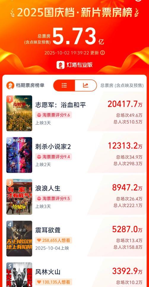 据灯塔专业版数据,截至10月2日19时39分,2025年国庆档票房达5.73亿元,《志愿军:浴血和平》《刺杀小说家2》《浪浪人生》暂列前三。据江苏省电影局初步统计,10月1日当天,全省产出票房3404万元,占比10.6%;观影总人次超88万,占比10.6%。