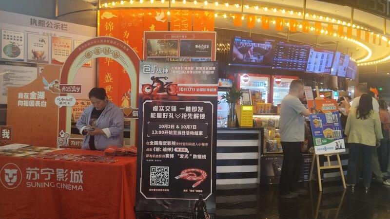 10月1日晚,在淮安苏宁影城金湖人民路店,一抹靓丽的“中国红”率先映入眼帘。影院入口处的“祖国生日快乐”祝福墙、海报,将节日氛围拉满,晚上的黄金场次吸引众多观众入场。不少家庭观众接受记者采访时表示,趁着国庆节这一时间节点,带老人孩子一起观看《志愿军》与《731》,非常有意义。