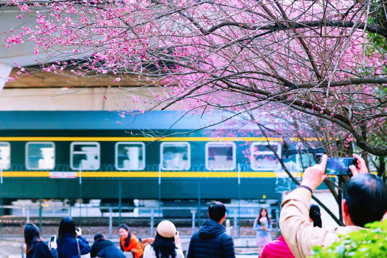 《穿过春天的列车》。2025年3月2日,拍摄于杭州市区铁路旁,初春的列车开过,美丽的风景引得来往的游人纷纷打卡。