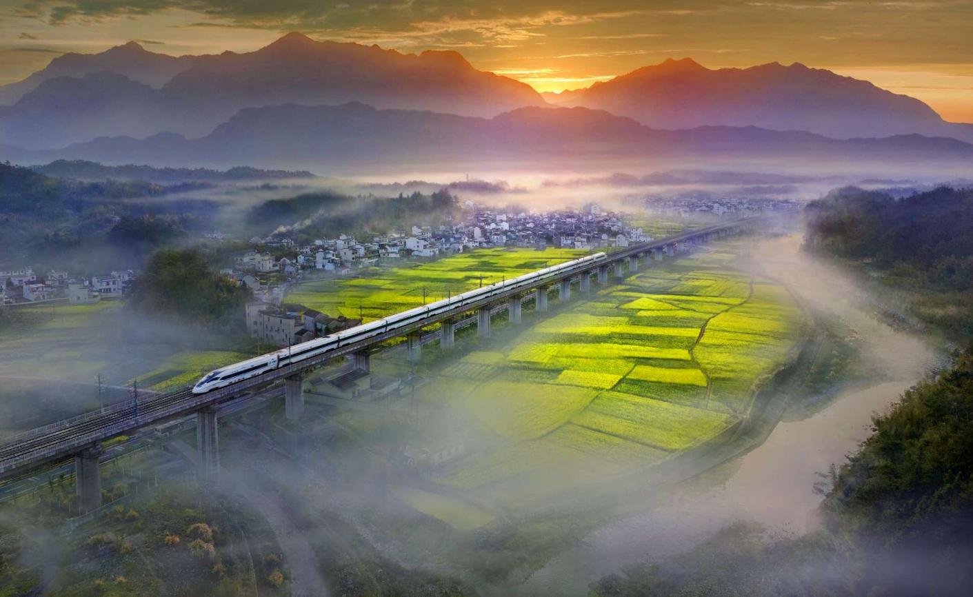 《绩溪县高铁飞驰》。2024年3月,拍摄于安徽省绩溪县。高铁列车行驶在中国大地上,凸显出中国高铁的建设成就以及人与自然、现代交通和谐共存。