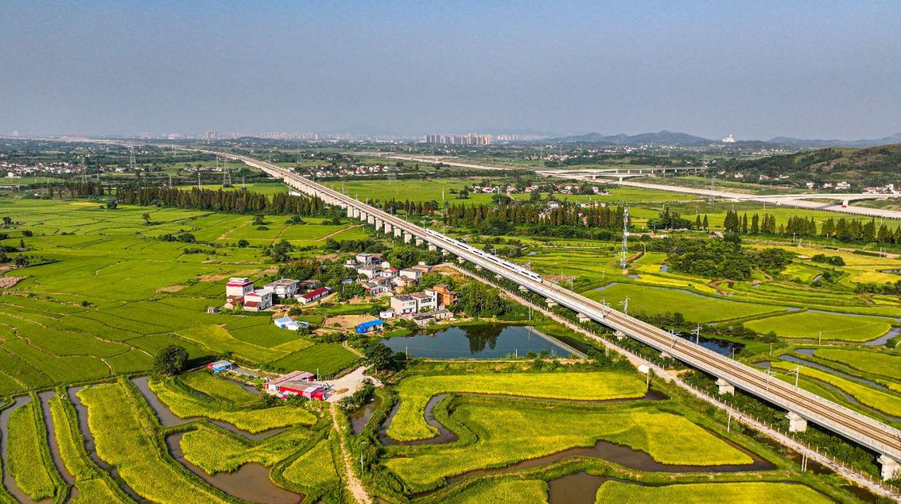 轨织千程网,铁骨横空,银箭匆忙。载春潮涌动,客逾千千万,货运重洋。更牵沪宁杭歙,松影映波光。正笛破烟岚,轮飞玉练,串起千芳。