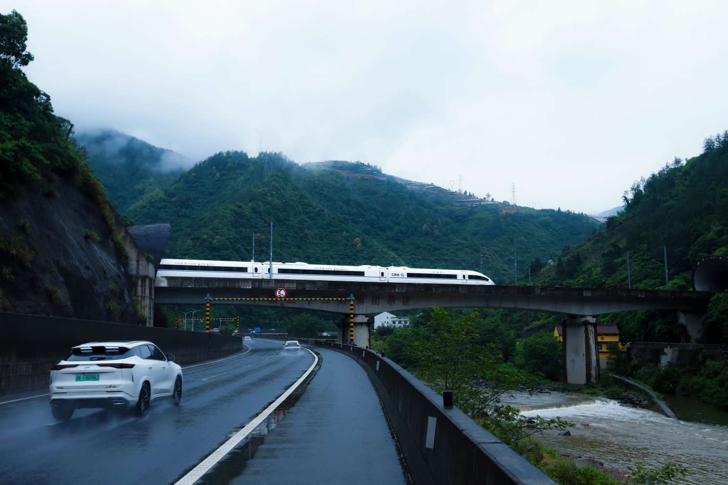 《高铁穿梭丛山间》。2025年5月18日,浙江丽水333省道,一辆高铁穿梭在丛山之间,与远处迷雾山顶的新能源光伏及近处的新能源汽车,彰显发展速度。