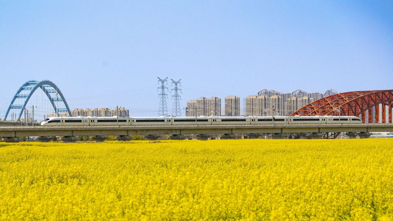 《铁路旁盛开的油菜花》。2025年3月22日,安徽省合肥市肥西江淮大道,一列动车组行驶在合安高铁上,铁路旁是正在盛开的油菜花。