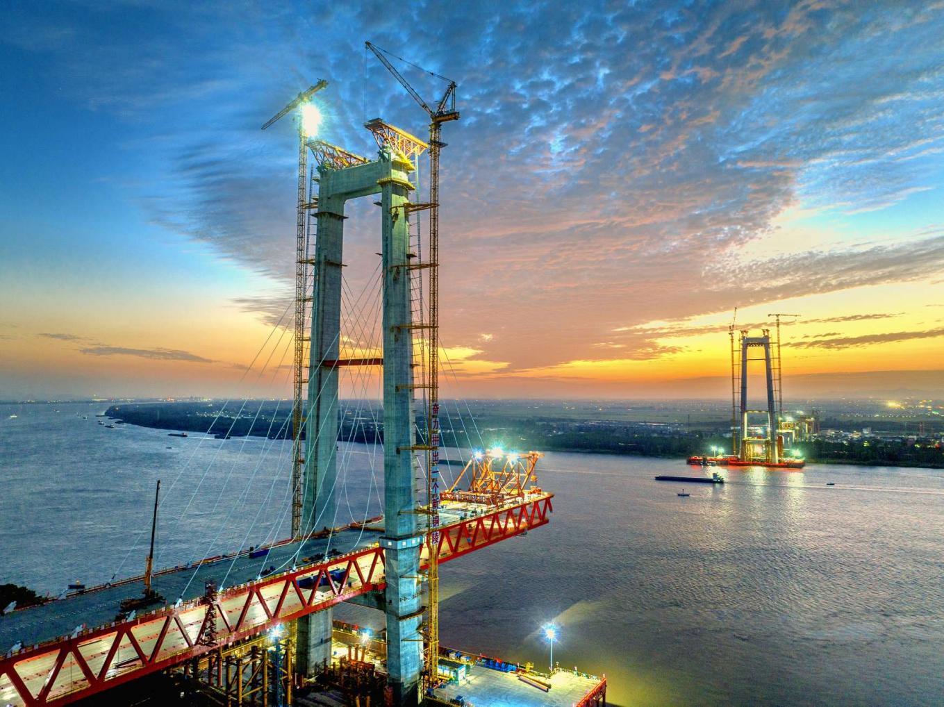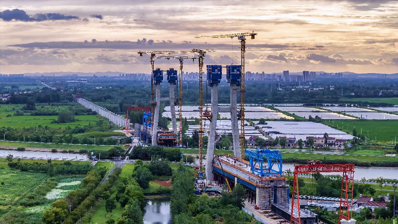 《筑梦新途》。2025年7月30日傍晚,位于南京市浦口区津浦铁路旧址旁的沪渝蓉高铁(南京段)跨滁河斜拉桥施工现场。