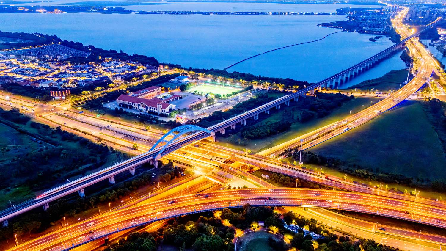 《通海达湖的富饶》。2025年6月29日拍摄于江苏省苏州市阳澄湖景区。夜幕,阳澄湖畔交通发达商业发达。