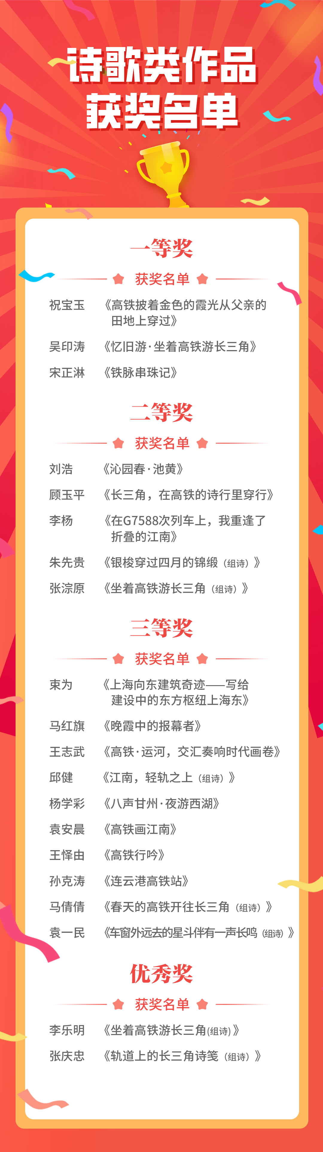 经过综合评定,最终诗歌类和摄影类各评选出一等奖3个、二等奖5个、三等奖10个、优秀奖2个。现在,让我们一起来欣赏这些获奖作品,为这场跨越春、秋的“轨道诗旅”画上圆满句点,也让“诗与远方”在长三角的钢轨上留下最温柔的回声。