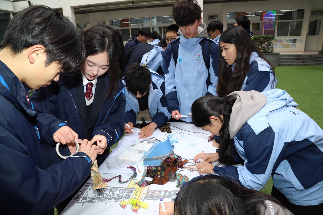 在创作过程中,仙外国高的学生们不时向华裔同伴介绍画中的南京元素:这是中华门的瓮城结构,那是云锦的经典纹样,这是梧桐叶的形状——南京的城市符号。而华裔学生们也分享着他们在海外见到的中国元素如何被重新诠释和创新。