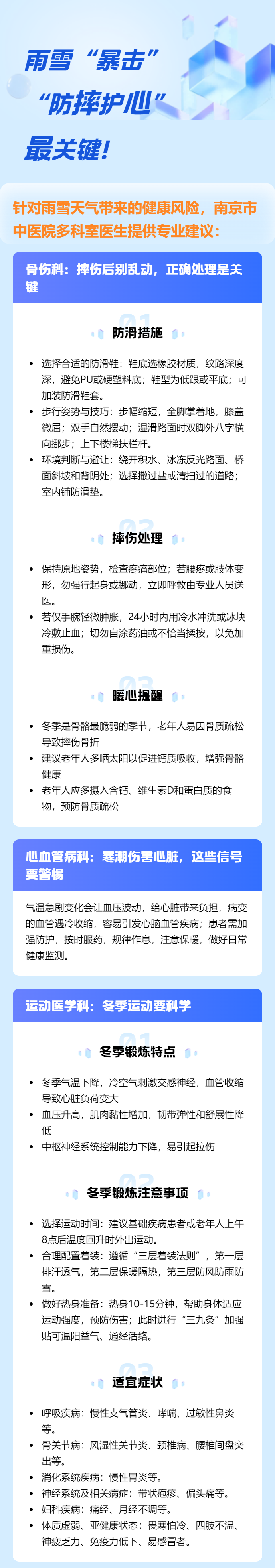 大寒节气将至,看着这一周天气,小编表示瑟瑟发抖。天气寒冷,雨雪纷飞,路面湿滑,南京市中医院提醒:“雨雪天摔伤风险激增,老人、儿童、心脑血管疾病患者需格外警惕。”