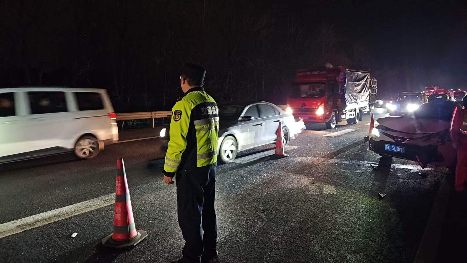 2月6日春运第五天,第三大队在18时30分接到警情:连霍高速连霍方向K214+400处突发两车追尾事故,一名群众头部受伤流血,随车儿童受惊吓哭闹不止。警情就是命令,执法人员闻令即动,火速驱车赶往现场进行处置。在现场,大队执法人员与赶来的高速交管、养护中心、排障救援、医疗救护等单位部门人员高效协作:布设警戒标志、设置安全防护区域、引导过往车辆减速避让、救助安抚伤员、快处现场事故、清扫路面杂物。19时20分,完成现场处置,交通恢复正常通行,春运车流有序前行。