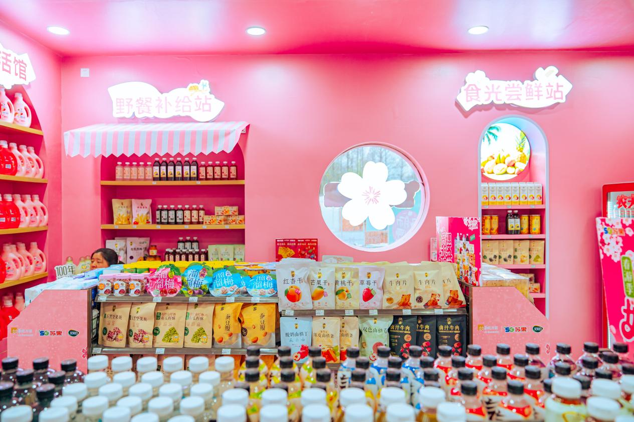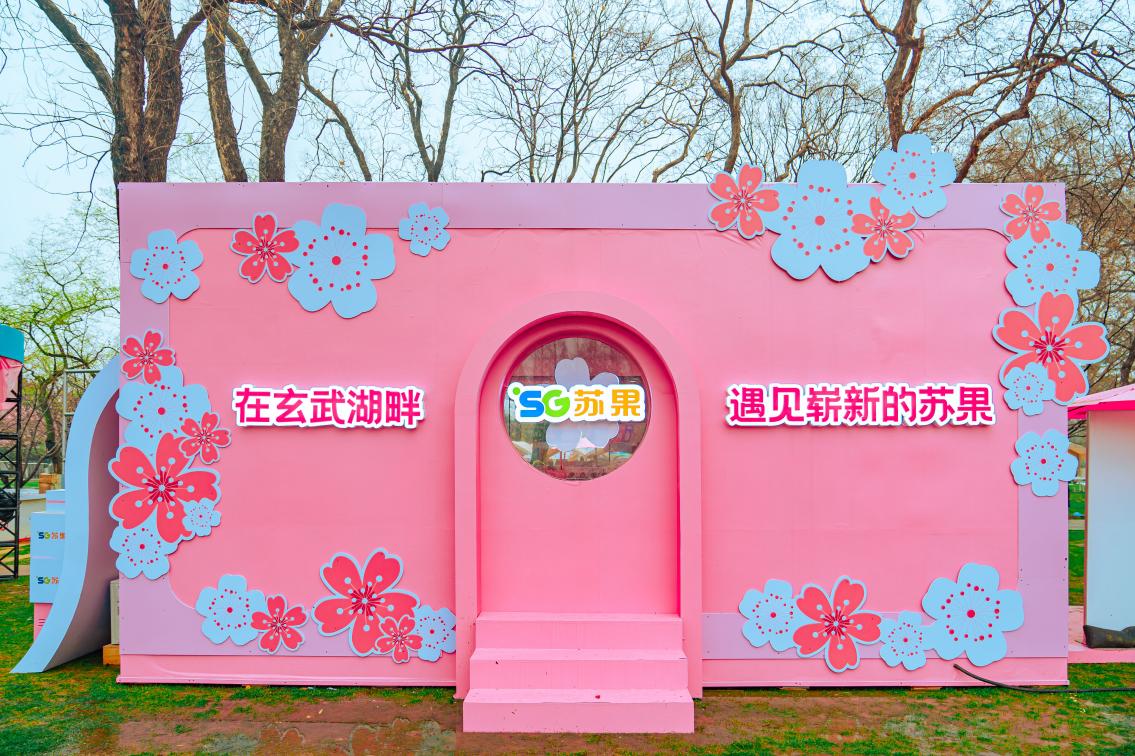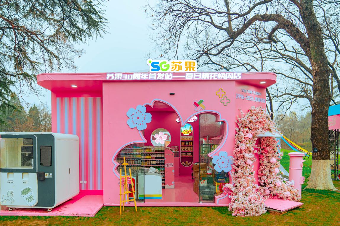 三月的南京玄武湖樱洲,樱花如云,游人如织。在最美的赏樱核心区,一座以樱花粉为主色调的“苏果30周年春日焕新快闪店”悄然绽放。