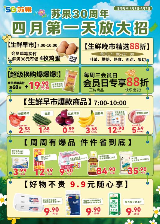 此次“四月放大招”活动,是苏果超市在30周年之际推出的系列举措之一。围绕生鲜早晚市、9.9元好物专区、超级换购等核心板块,苏果超市通过调整营业节奏、优化商品结构、创新营销玩法,以更贴近消费者需求的方式,重塑“家门口的超市”这一品牌认知。