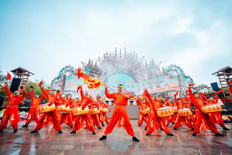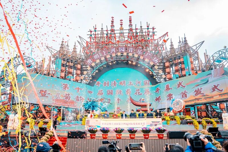 开封清明上河园内鼓乐齐鸣、菊香四溢,