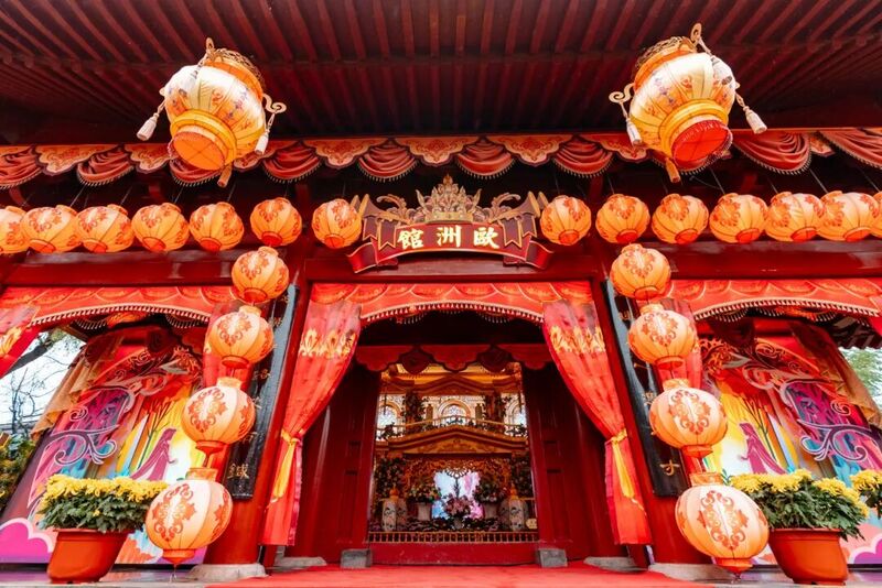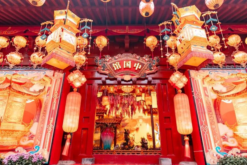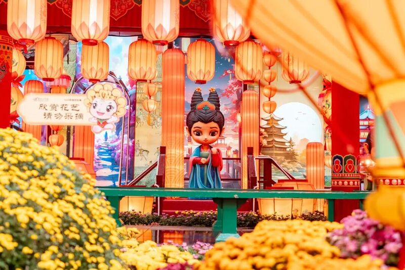 菊文化馆以传统门廊为文化容器,连接历史庆典与当代节庆美学,展示梅兰竹菊、宋代点茶、青绿瓷盘等,呈现中式传统菊艺与现代美学的完美融合,让人在欣赏菊花的同时,感受到传统文化的深厚底蕴。