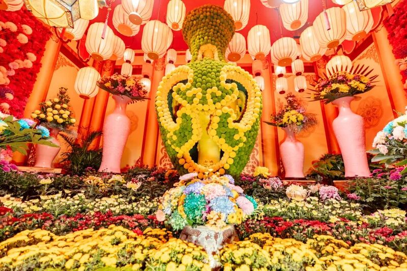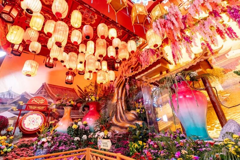 东南亚馆将泰国传统建筑与菊花巧妙结合,搭配泰国传统花卉布置风格和丝绸花布等装饰,营造出浓郁的泰国风味氛围,仿佛让人踏上了一片充满异域风情的热带土地。