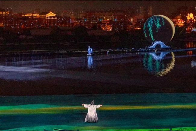 演出在一片静谧的水面上拉开帷幕,当代青年手捧菊花灯缓缓登场,一段极具感情的独白点燃现场气氛,也为整场演出奠定了历史与文化的基调。