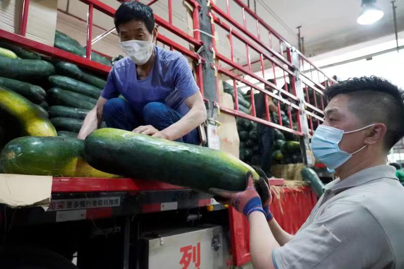 众彩市场工作人员表示,每年5月至11月,是全国南菜北菜同时上市时期,因此市场菜品最全,有莴笋、西葫芦、芹菜、包菜、大白菜等20多个品种。目前,市场蔬菜日均到货量约3000吨,果品日均到货约2000吨。