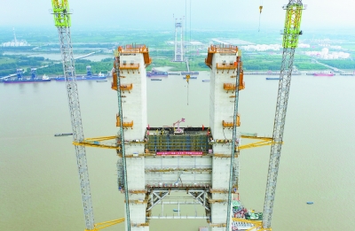 昨天,南京仙新路过江通道南主塔上横梁顺利完成施工。 通讯员 李育峰 杨泽培 南京日报/紫金山新闻记者 徐琦 摄