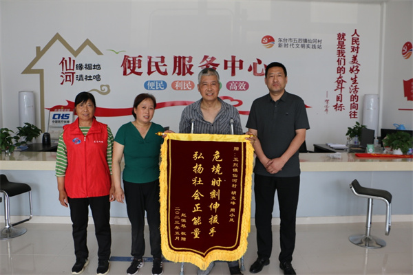中国江苏网讯 6月14日下午,东台市五烈镇文华村二组49岁的村民赵恒琴夫妇来到五烈镇仙河村村部,将一面绣有“危境时刻伸援手,弘扬社会正能量”的锦旗赠送给该村网格员胡克峰、周小凤,真诚感谢他们在危险时刻及时组织开展援助的救命之恩。