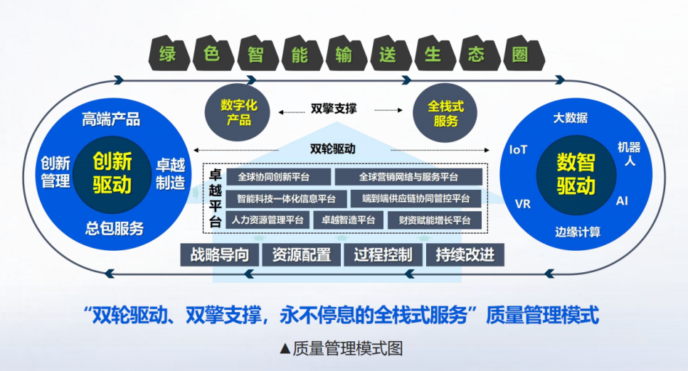 通过打造高水平创新平台,以创新驱动提供持续竞争力,以数智驱动赋能高质量发展,引领智能输送工业互联生态圈建设,目前此质量管理模式已在全球5家子公司复制应用。