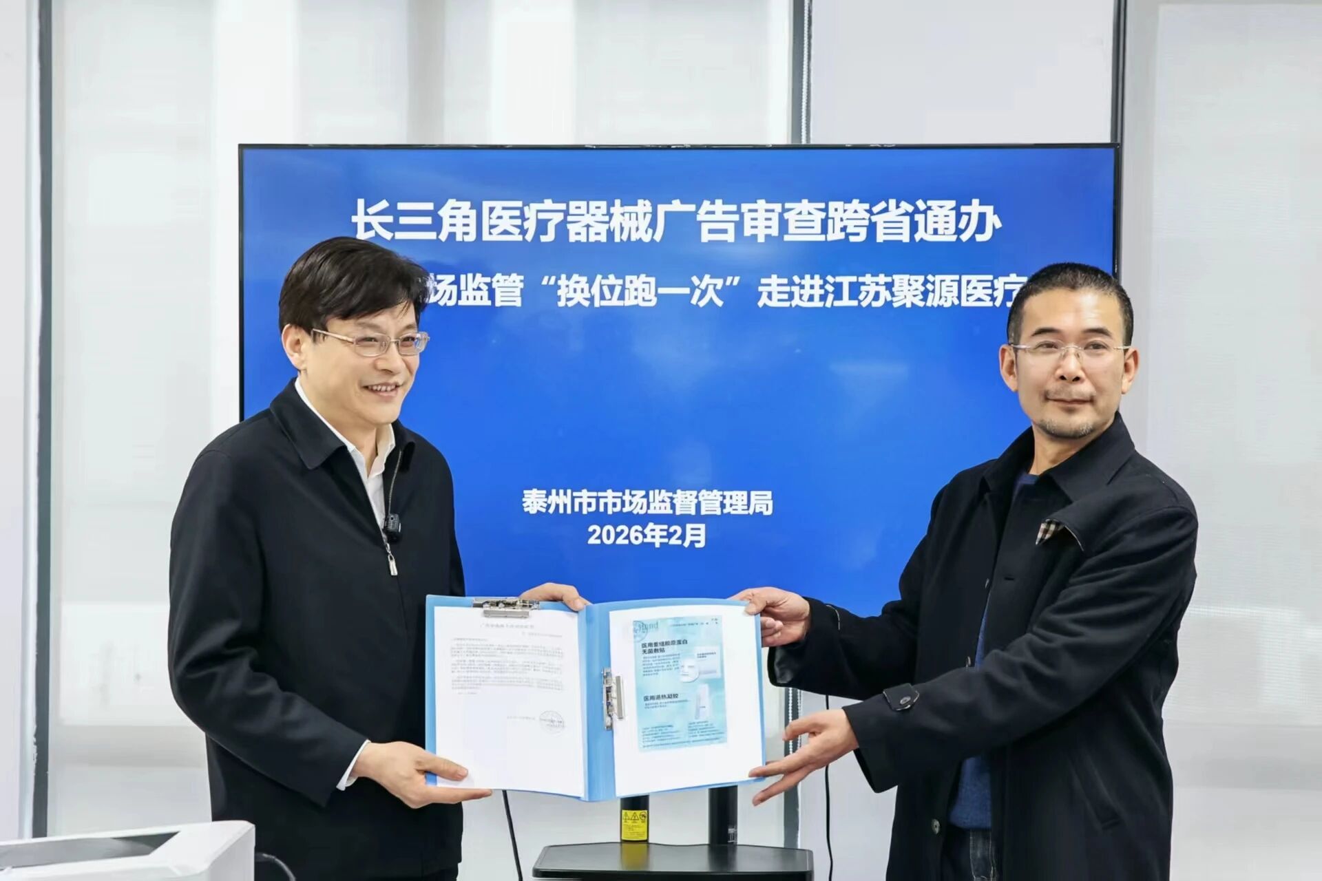 交汇点讯 2026年1月,市场监管总局批复同意长三角地区开展医疗器械广告跨区域审查试点工作。2月27日下午,泰州市市场监管局党组书记、局长张汉刚走进江苏聚源医疗技术有限公司,以“换位跑一次”形式现场指导企业完成医疗器械广告跨省申报,并将全省首张医疗器械广告审查跨省通办批件,发放至江苏聚源医疗技术有限公司负责人常亮手中。
