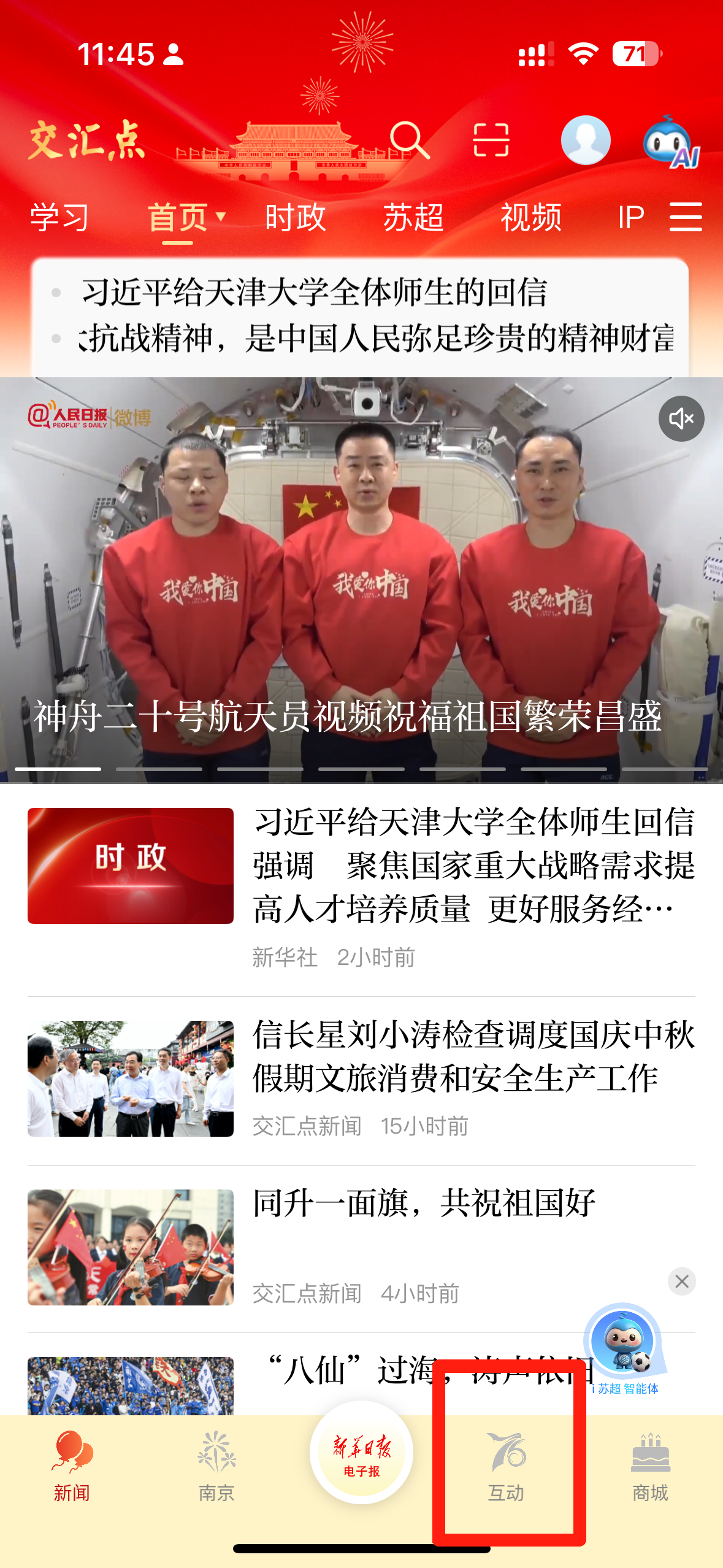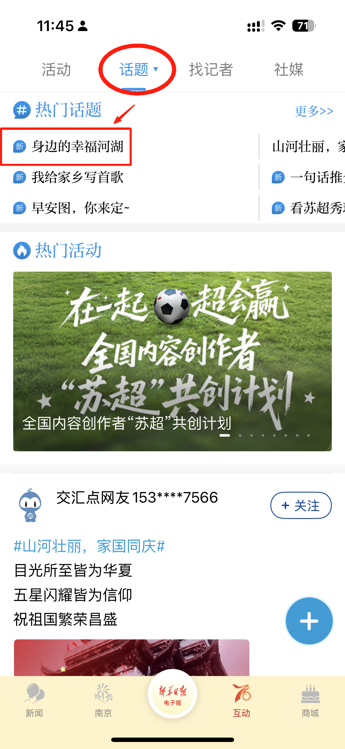 2、进入“交汇点新闻”,首页底部菜单栏点击“互动”,进入话题,即可发布作品并参与征集。