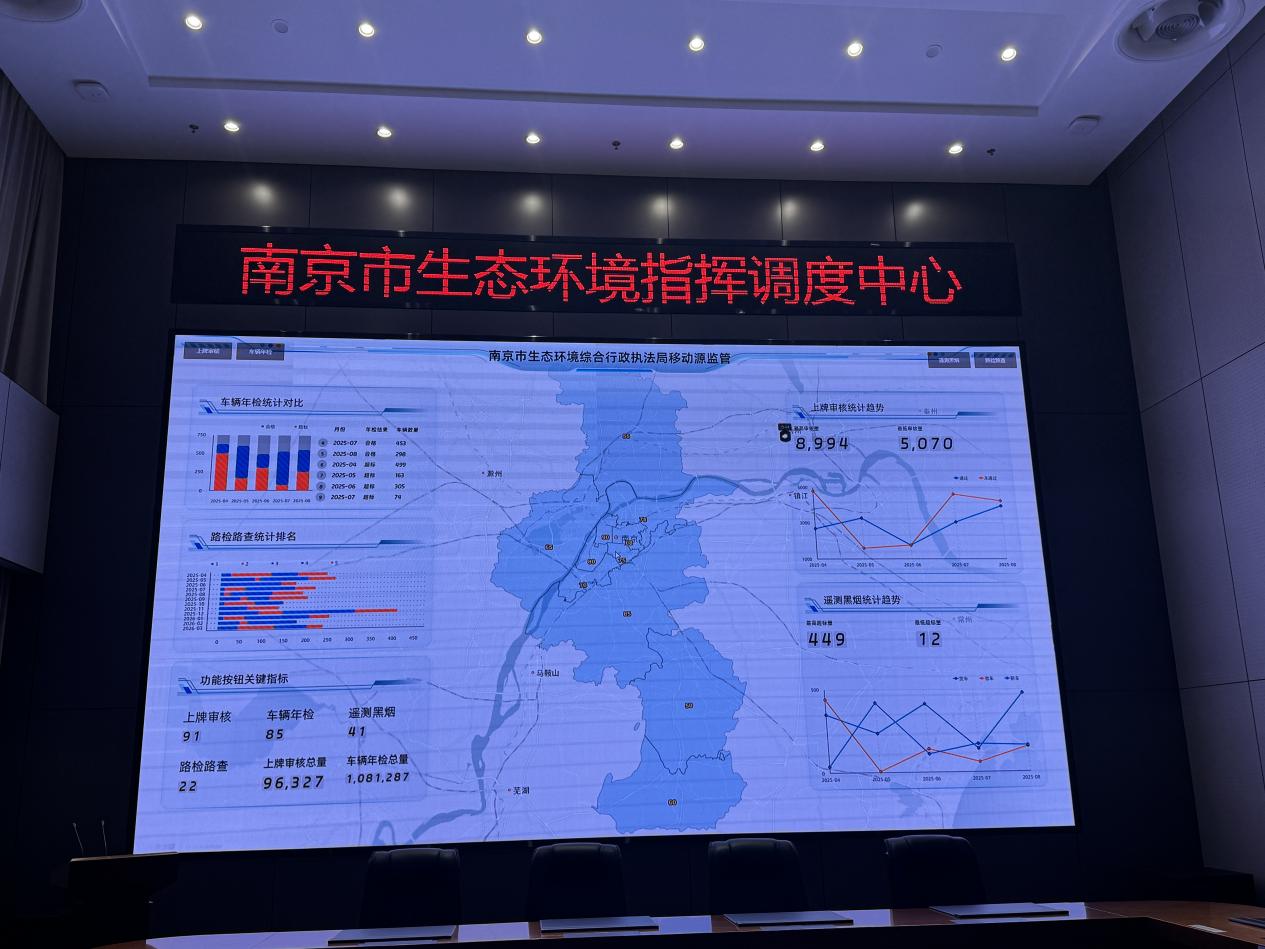 走进南京市生态环境综合行政执法局调度大厅,显示屏上全市排放检验机构的实时数据、重型柴油车的远程在线监控信息正在不间断跳动。