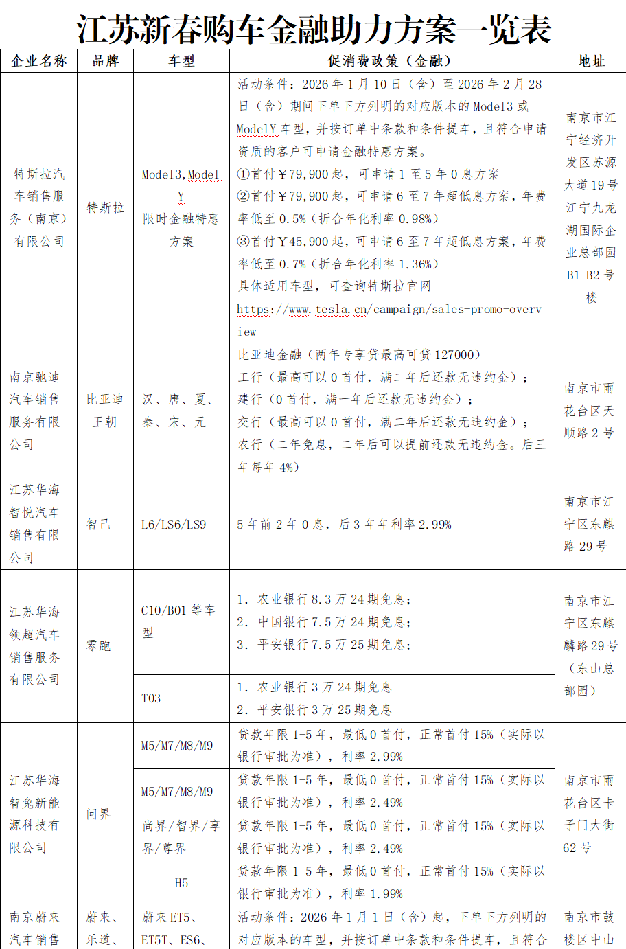 购置税政策调整不用愁,江苏多家金融机构与汽车销售企业联手送福利!为对冲2026年新能源汽车购置税减半征收带来的购车成本变化,金融机构、主流车企车商推出专属金融购车特惠,特斯拉、比亚迪、蔚来、理想、小米、零跑、智己、领克等热门新能源品牌全覆盖,各品牌定制化金融方案齐上阵,0首付、0利息、超长低息贷随心选,轻松降低购车压力,春节开新车走亲访友、自驾出游,趁优惠入手正当时!