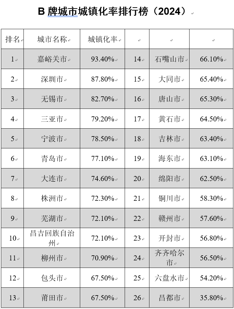 B牌城市的城镇化率出现了变数。常住人口最少的嘉峪关市以 93.4% 居首,经济最强的B牌城市深圳 87.8% 紧随其后,无锡、三亚、宁波、青岛均超 77%,多为东部沿海或资源型城市;城镇化率在 65%—75% 区间的城市共 10 个,涵盖东中西部,如大连、柳州、株洲等;低于 60% 的城市共 6 个,主要集中在中西部及东北老工业基地,其中昌都仅 35.8%。总体而言,26个B牌城市的城镇化率也呈现了东、中、西部地区的分化结构。