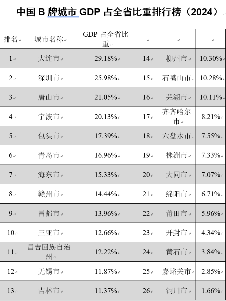 B牌城市在省内发展各有千秋。本研究报告梳理的数据以2024年为准。数据显示,B牌城市的发展呈现出显著的梯度差异,这种差异与常住人口规模、人口流入流出态势、人均产出效率形成了清晰的对应关系,部分城市凭借经济与人口的良性互动实现能级跃升,部分城市则因经济低迷与人口流失的恶性循环陷入位次下滑。这次四个排行榜,主要包括全国范围内B牌城市的经济实力排行,B牌城市的常住人口排行,B牌城市的城镇率排行,B牌城市各自在省内全省GDP总量的占比排行,B牌城市与A牌城市即省会城市的GDP占比排行榜和B牌城市的人口与A牌城市人口占比排行榜,以上述排行榜诠释全国各省区的B牌城市的发展概况。