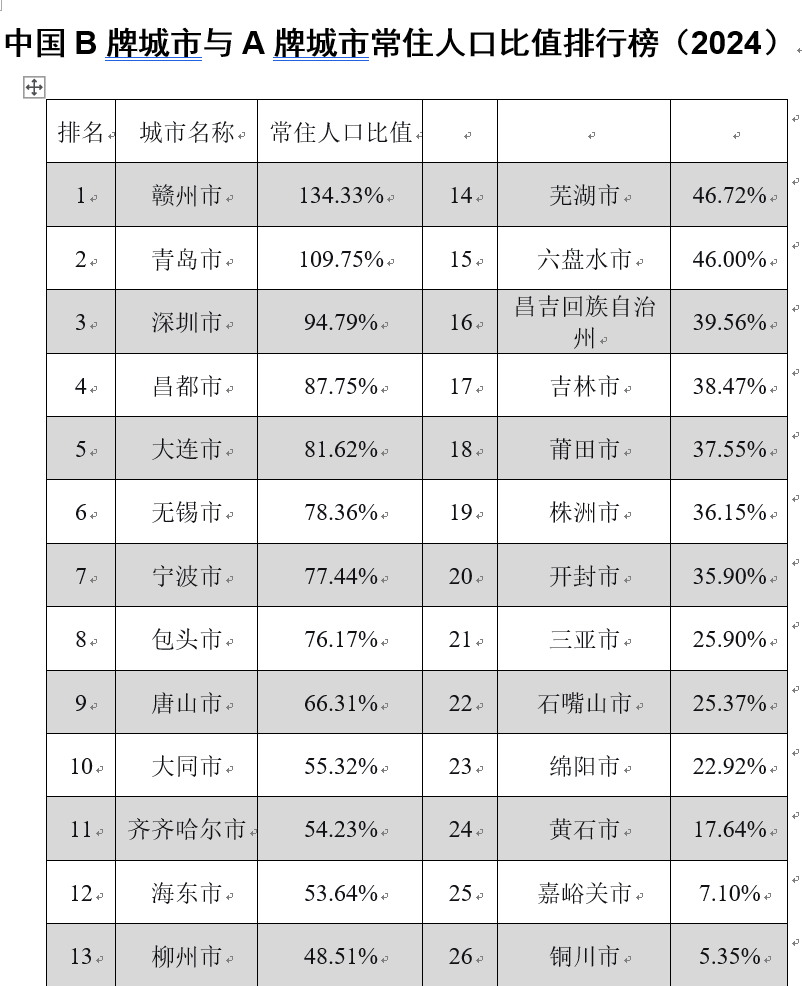 B牌城市的常住人口与经济总量呈现较高的相关度。深圳、青岛都是千万级人口超特大城市;而昌都、石嘴山、铜川和嘉峪关4个城市的常住人口不足百万。总体显示中部与西部的 B 牌城市人口普遍低于东部沿海地区B牌城市,也呼应了胡焕庸线的人口模型。