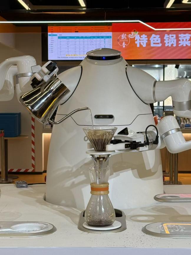 除各类餐饮外,AI·镜界餐厅还推出智能咖啡机器人。双机械臂协同下,机器人作业有条不紊:一只手臂负责磨粉、压粉、萃取,另一只控奶泡融合与拉花,可以拉出像郁金香、天鹅颈这样的团,还能“来图打印”做照片级可食用拉花。