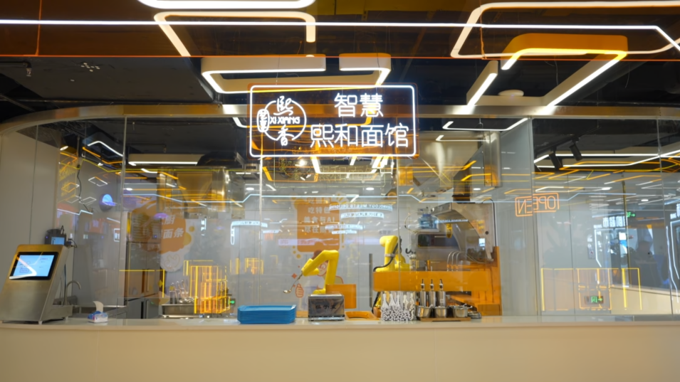 在智慧熙和面档,两个机械臂熟练“拿捏”起面点师傅技能,用餐者下单后,AI算法控制水温与煮面时间,经过和面、切面、煮面、捞出、浇头、装盘等步骤,平均2分钟就可以完成一碗热腾腾的浇头面。不仅可堂食可外带,还能实现叫号管理。这样的“熟练工”一餐可以完成200碗汤面的出餐需求。