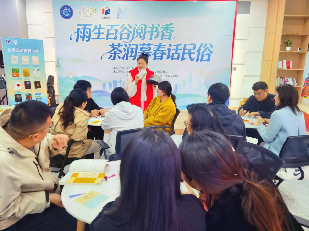 谷雨时节,万物生长。在首个“全民阅读活动周”期间,由南通市崇川区新闻出版局、崇川经济开发区新时代文明实践所及新胜社区联合举办的“茉莉花开・艺通江海”文艺直通车——“雨生百谷阅书香,茶润暮春话民俗”主题阅读活动在信创园党群服务中心开展。活动以谷雨节气为契机,让居民在暮春时光里品民俗、读好书、叙温情,营造出邻里和睦、书香充盈的社区氛围。
