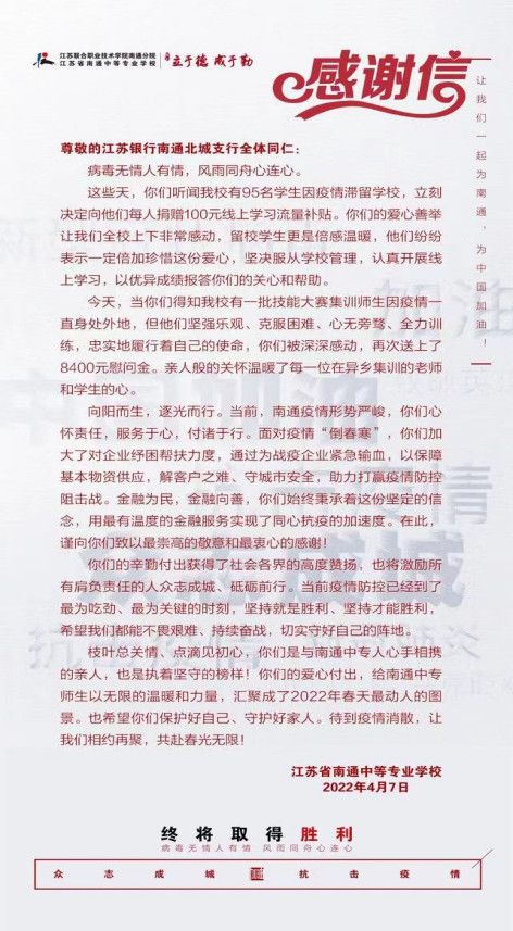 当前,南通市中小学根据要求开展线上教学活动。得知南通中专部分学生因防控需要滞留学校,4月3日,江苏银行南通北城支行第一时间联系学校,向留校学生捐赠每人100元线上学习流量补贴,用于疫情防控期间网课学习。4月7日,得知南通中专有一批技能大赛集训师生因新冠肺炎疫情身处外地,北城支行再次送上8400元慰问金,用亲人般的关怀温暖了每一位在异乡集训的老师和同学的心。